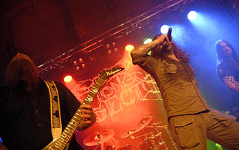 BULLET kliver av scenen och en stunds paus följer. Sakta men säkert bildas en tätare folkmassa framför scenen och det råder inga som helst tvivel om vilket band publiken är här för att se. Efter en inte allt för lång väntan kliver snubbarna i GOD AMONG INSECTS upp på scenen i det finaste zombiesminket Öl & Vin-bolaget har att erbjuda. Innan bandet ens hinner ta första tonen förstår jag att det GOD AMONG INSECTS jag ikväll ska få se, är en klart uppgraderad version av det band jag såg i Bengtsfors för några år sedan. Tobben Gustafsson (VOMITORY) räknar in första låten och sedan är renset ett faktum. Bandet öppnar med käftsmällen "The First House" som är öppningsspåret på årets utgåva "Zombienomicon" och andra plattan i bandets katalog. Under kvällens gig bjuds det på örhängen från båda plattorna och något som är ganska signifikant för det uppgraderade GOD AMONG INSECTS är herr Caligulas mellansnack, som faktiskt innehåller en del humor. Humor är som bekant något vi inte är vana vid att höra då mannen med C vanligtvis presenterar låtar med sitt andra band DARK FUNERAL. Här ges det dock tips om vad man kan göra då Jehovas vittnen spontanbesöker ens hem när man är som mest bakfull, som prolog till "Chainsawed Christians" från 2004 års debutalseter "World Wide Death". Det snackas även om bakgrunden till textmaterialet i "Uhr Nazuur", som tydligen är skriven på "Zombiska", ett kreativt språk herr Caligula själv snickrat ihop.