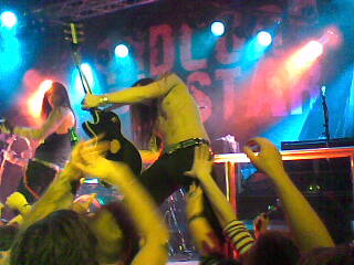 HARDCORE SUPERSTAR rullar igång sin show, som med all den rutin gänget har är ett synnerligen väloljat maskineri. Särskilt frontmannen Jocke Berg imponerar i sin inlevelse, då han under spelningen konsekvent dansar järnet på ett sätt som hade gett ELVIS höfter en släng av avundsjuka, och därtill regelbundet ser till att high five:a med publiken framme vid scenkanten. Efter tredje låten ”Split Your Lip” påtalar Jocke att han är bördig från Borås, och nämner något om staden som världens åttonde underverk. Det skamlösa publikfrieriet går naturligtvis hem, och när bandet sedan öser vidare med pärlor som bland andra ”My Good Reputation”, ”Wild Boys” och ”Dreaming In A Casket” är stämningen på topp. Mitt mest bestående intryck från kvällen är just att bandet själva verkar ha minst lika roligt som publiken. Både Vic Zino (gitarr) och Martin Sandvik (bas) har leenden från öra till öra setet igenom, och Jocke Berg ser som sagt ut att ha trillat ner i uppåttjack-grytan som barn.