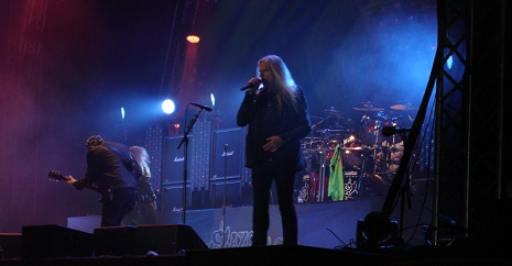 Lite vila i skuggan var precis vad jag behövde för efter ca en timme när det är dags för de tyska AXXIS att gå på scenen är jag piggare igen. AXXIS går ut hårt med några upptempospår från de senare plattorna för att en bit in i setet fokusera på äldre material. För den som inte känner till AXXIS så började de som ett melodiöst hårdrockband, men de har med åren blivit mer metalliska och idag skulle jag nog kategorisera dem som ett power metal-band. Förutom en svacka under andra halvan av 90-talet gillar jag det mesta de gjort och jag uppskattar därför att få höra låtar från hela karriären. Ett band som bara har en timme på sig borde egentligen inte hålla på och ”tramsa”, men det är ändå lite småroligt när en ung kille i publiken får gå upp på scen och lira både tamburin och trummor med bandet. Och när avslutningen består av allsångsnumren ”Living in a World”, ”Little Look Back” och ”Kingdom of the Night” är det synd att klaga. Mycket bra!