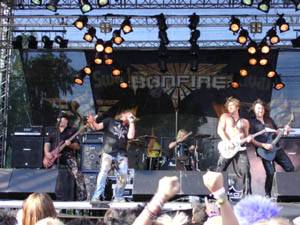 Strax innan PORCUPINE TREE spelat klart tar jag plats framför den scen där BONFIRE ska spela. Enligt egen utsago har inte bandet spelat i Skandinavien på 16 år och det var väl ungefär då jag slutade bry mig om dessa melodiösa tyskar. De tre första plattorna med "Fire Works" (1987) som högsta topp är ju dock riktigt bra, så vissa förhoppningar om en skön nostalgitripp har jag. BONFIREs spelning blir åtminstone nästan lika trevlig som jag hoppades och visst står jag där och sjunger med i gamla hits som "Never Mind", "Sweet Obsession" och "Ready 4 Reaction". Kul, men med en så begränsad speltid som 40 min undrar jag stilla varför de klämmer in en cover på den minst sagt uttjatade "Sweet Home Alabama". Ofattbart!