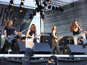 Dagen börjar med en liten krock för min del. Hade gärna sett CLOUDSCAPE, men när konkurrensen kommer i form av ARCH ENEMY är valet ändå ganska enkelt. Blir lite förvånad när jag ser hur mycket folk som samlats framför scenen trots att klockan bara är 12. ARCH ENEMY är tydligen mer populära än jag trodde. Bandet levererar sin melodiska dödsmetall på ett utmärkt sätt. Sångerskan Angela Gossow låter kanske inte riktigt lika bra som på skiva, men jag kan inte låta bli att förundras över hur denna lilla späda kvinna kan growla som en hel karl. ARCH ENEMY är riktigt bra och dagen har börjat på ett mycket tillfredsställande sätt.