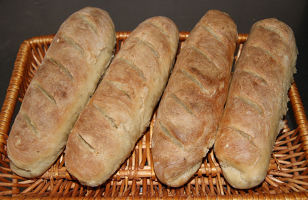 Skär ett par snitt med vass kniv i varje baguette. Grädda mitt i ugnen i 8 minuter.