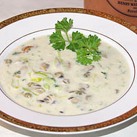 Tillsätt grädden och de väl avrunna musslorna. Låt soppan få ett snabbt uppkok.