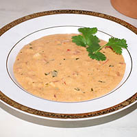 1 röd lök 1 röda chili 1/2 gul paprika 1/2 röd paprika 5 dl fiskbuljong 2 dl grädde 200 g Philadelphia Naturell 3/4 dl tomatpuré 1 kruka färsk koriander 1-2 klyftor vitlök 1/2 tsk chilipulver 1/2 tsk ingefära 1/4 tsk spiskummin 1 msk socker 1/2 - 1 msk potatismjöl 150-200 g kräftstjärtar salt vitpeppar
